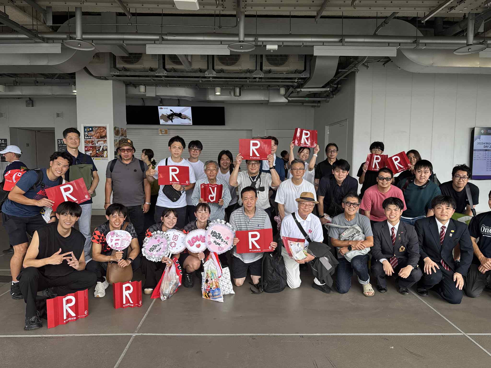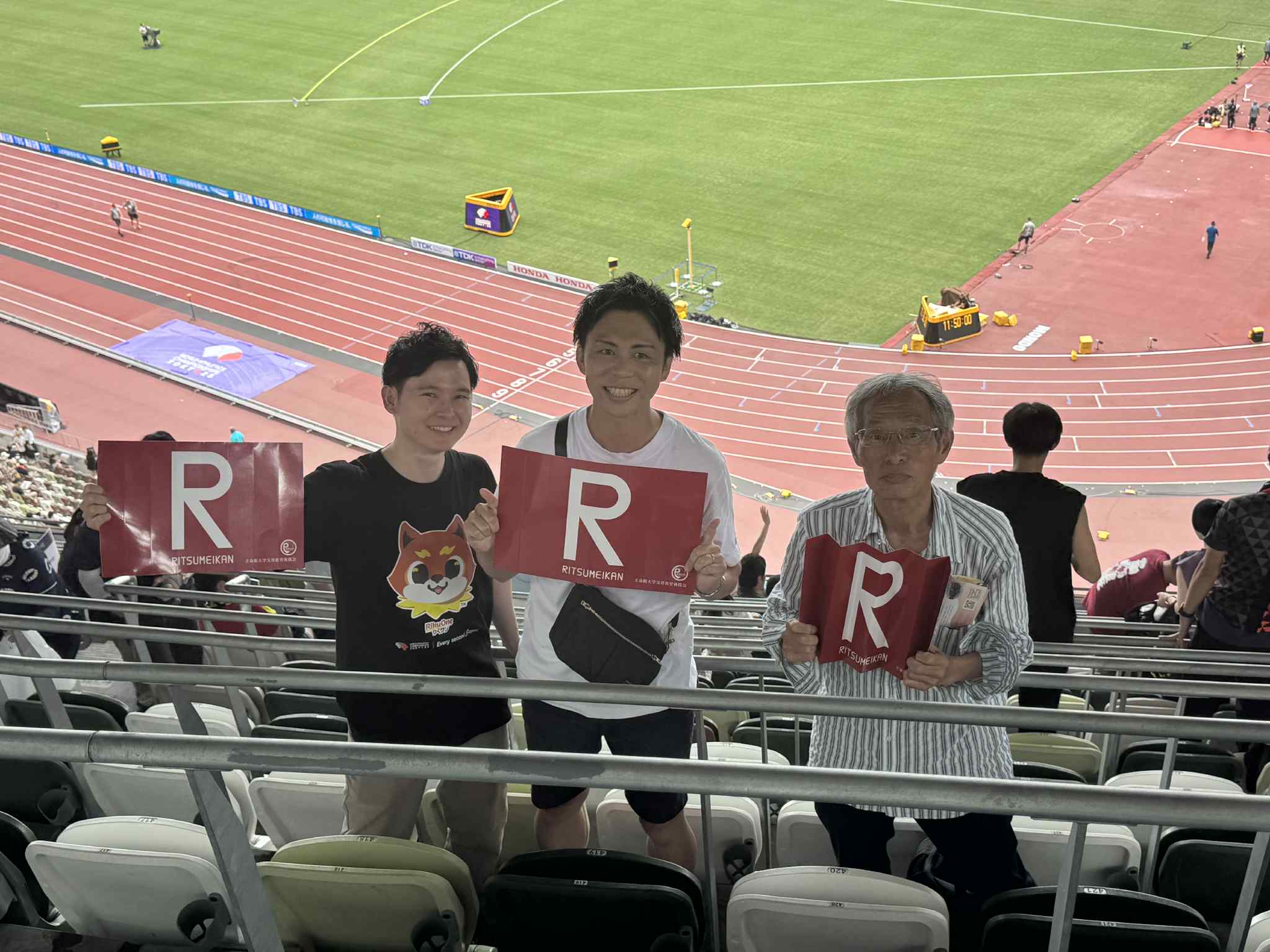 立命館応援席は、陸上部OB会長をはじめ、彼女と同期のメンバー、現役応援団長、校友会のメンバーなど、約30名がスタンドに集まり、声援を送りました。埼玉県校友会からは、中野さん、長谷川さん、加藤の3名が応援にかけつけました。