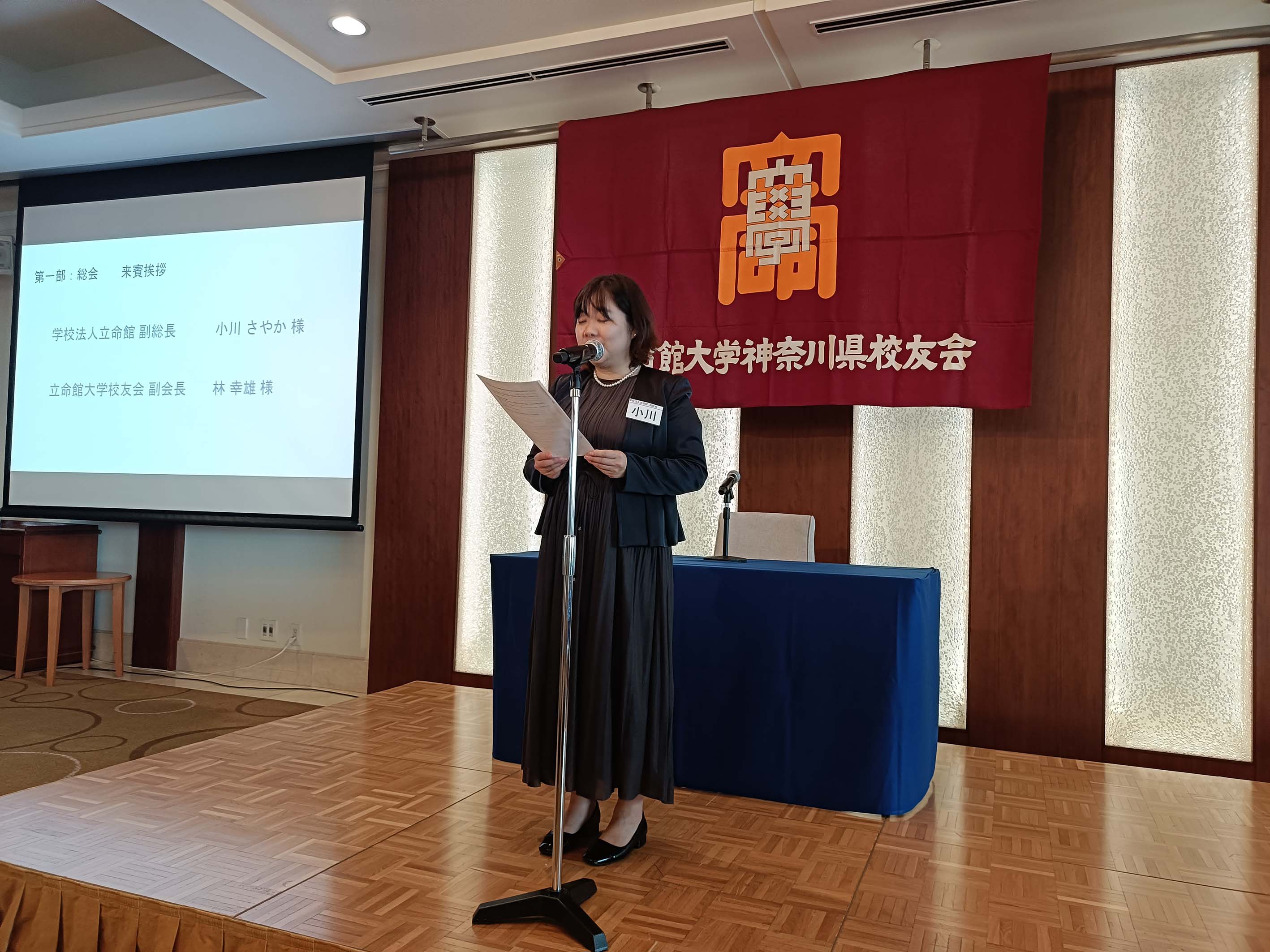 第一部:総会は、議事の後、学校法人立命館 小川さやか様 立命館大学校友会副会長 林幸雄様の来賓挨拶がありました。